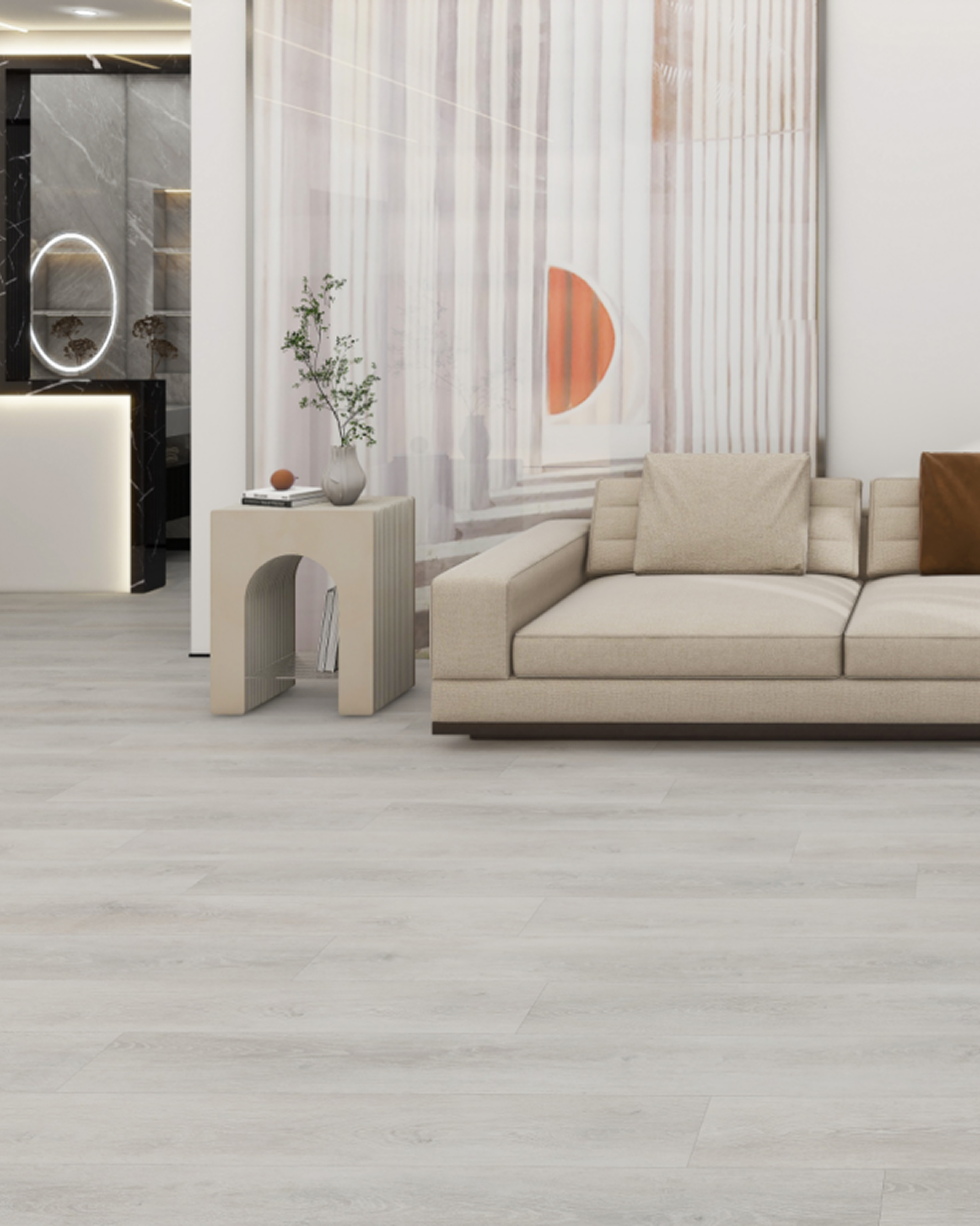 Rivawood Oak blends refined gray tones with subtle warmth, offering style and durability. With a 6.5MM thickness, 22MIL wear layer, and 1.5MM padding, it withstands heavy foot traffic and provides comfort. Perfect for residential and commercial spaces, its versatile gray hues complement various interiors. Matching trims complete the look.
